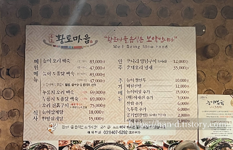 메뉴는 능이백숙, 능이오리백숙 등이 있는데, 송호황토마을의 시그니처는 오리진흙구이 입니다.