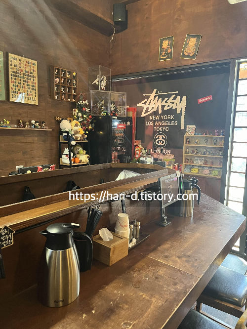벽면은 아기자가한 피규어와 요즘 보기 힘든 종이 달력으로 일본느낌의 분위기를 더해 주었고 잘 정돈된 테이블과 오픈형 주방은 청결함과 음식에 대한 신뢰감을 주었습니다. 그리고 꼭 둘이 같이 오지 않더라도 혼자 와서 먹기에도 좋은 일자 테이블과 자리마다 배치되어 있는 주문기계들로 라멘이 나오기 전이지만 다음에 혼자 방문해 볼 생각을 미리 해봅니다.