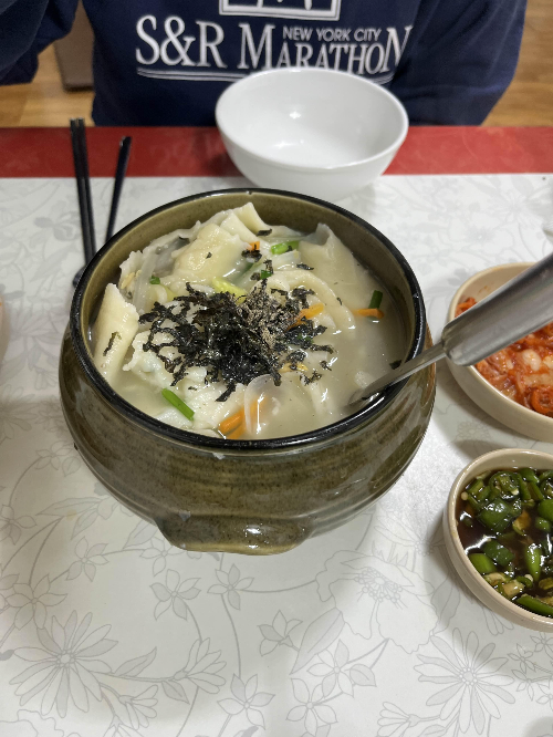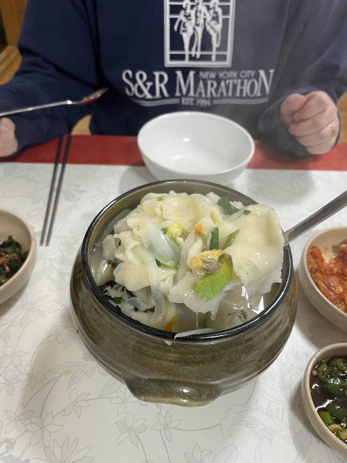 국물은 조금 적은 편지만 수제비와 잘 어우러집니다. 국물은 마늘과 후추가 베이스인듯 후추와 마늘맛이 느껴집니다.