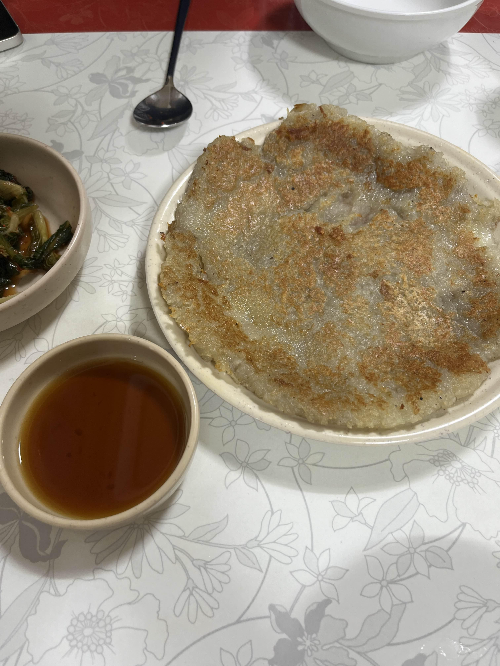 감자전 쫀득쫀득하고 바로 먹으면 맛있어요. 간은 쎄지 않기때문에 같이나온 간장과 함께 먹으면 맛있습니다.