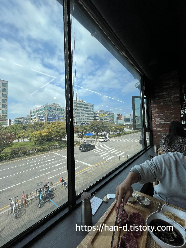 매장 내부는 좁지 않고 공간감이 있어서 담담하지 않고 깔끔 했습니다. 안내받은 창가자리는 통유리창으로 외부가 시원하게 한눈에 들어옵니다. 매장 공간과 외부 전경이 시원시원합니다.