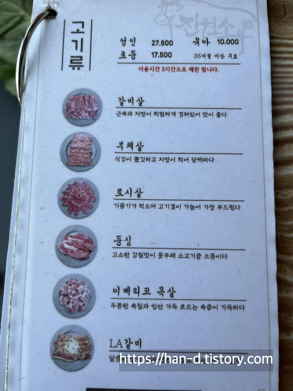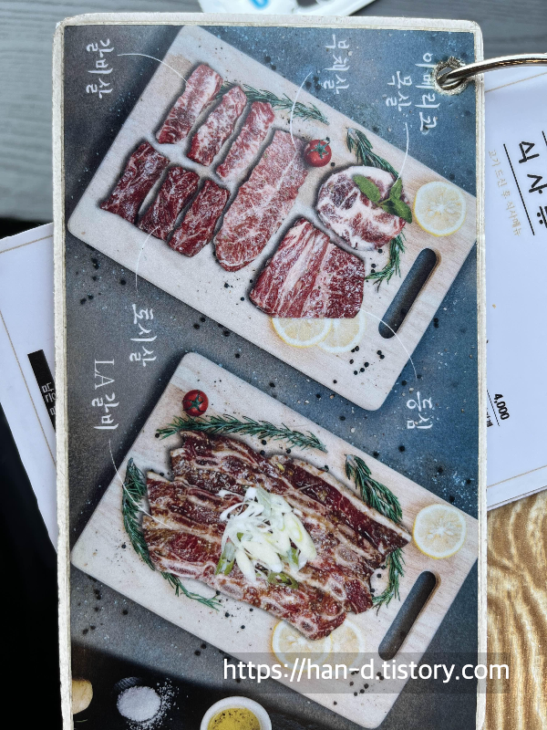 부챗살, 갈빗살, 토시살, 등심, 이베리코 목살, LA갈비 등이 있으며 야채와 채소도 가격에 포함된다.