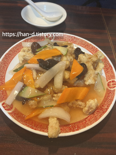 탕수육이 눅눅하지 않고 바삭바삭하며 고기도 부드럽고 잡내가 나지 않아 맛있었다.