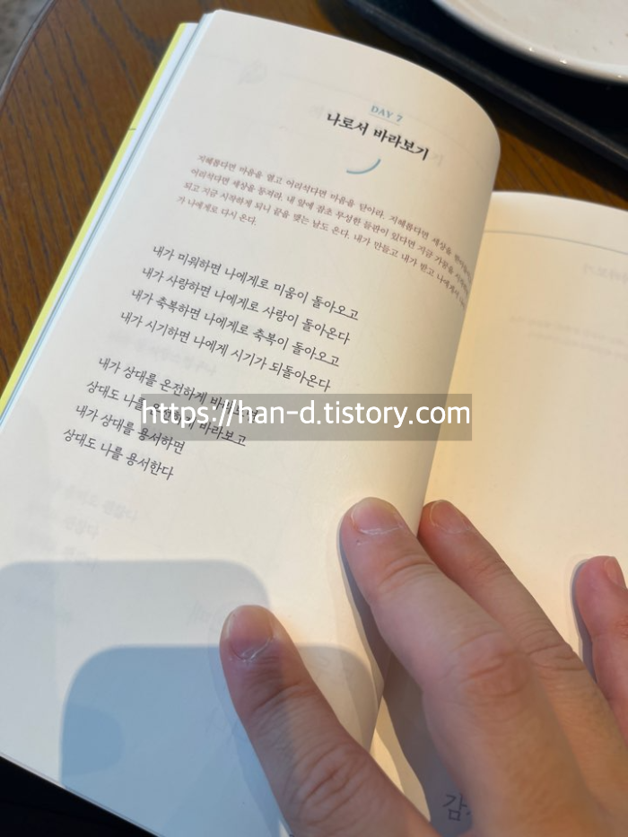 이 책은 내용이 많은 것이 아니라 하루하루 1장씩 책을 읽고 내용을 음미하며 내 마음을 어루만질 수 있는 시간을 가질 수 있다.