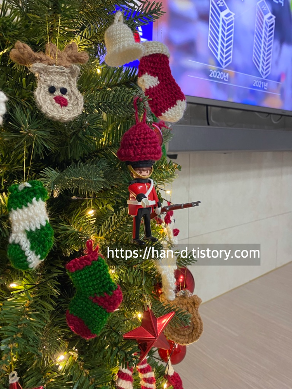 직접 뜨개질로 완성한 빨간 모자, 녹색양말, 귀여운 루돌프얼굴 장식 하나하나 모두 이번에 손수 만들 장식입니다.